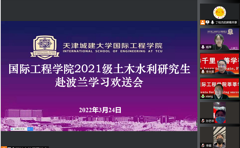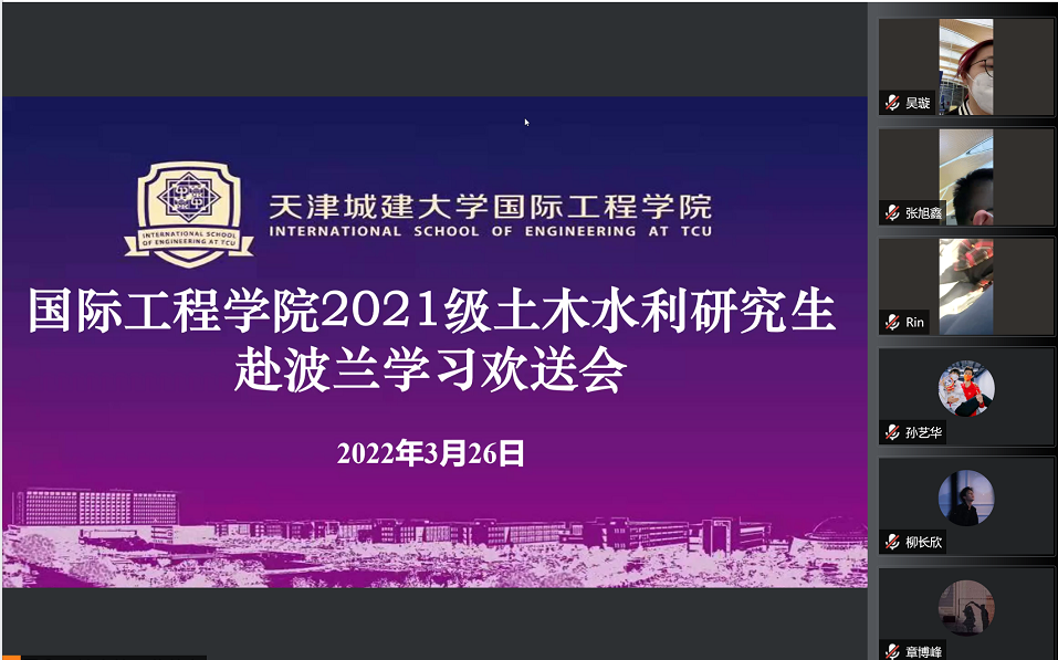 公司一直牵挂在外的学子,4月3日晚,公司领导班子杨萍、黄凌翔、李光旻与2021级土木水利研究生召开视频会议,看望达到波兰的同学们,了解大家的住宿、饮食、学习情况。经过几天的休整,同学们精神饱满,已基本了解校园概况,也习惯波兰当地生活,即将开始线下课程学习。