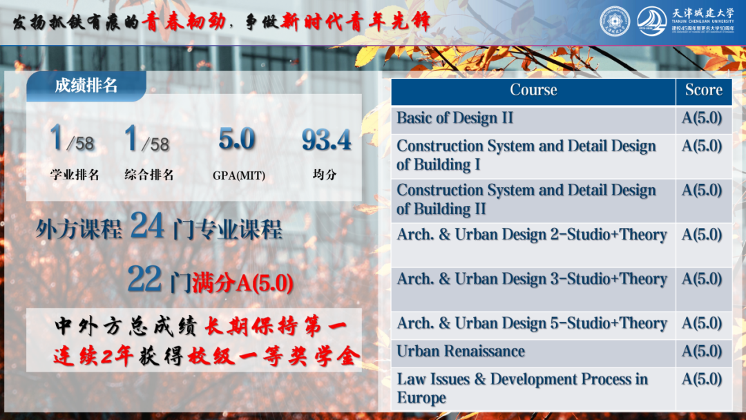 功不唐捐,玉汝于成。三年来,我的中外学业综合总成绩排名位列第一,外方课程24门,22门满分,获得国家奖学金、连续两年获得校一等奖学金。