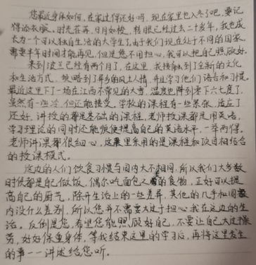 这边的人们饮食习惯与国内大不相同,所以我们大多数时候都是自己做饭,偶尔吃面包之类的食物,正好可以提高自己的厨艺,除开生活上的一些差异,其他的几乎和国家内没什么差别,所以您并不需要太过于担心我在这边的生话。反倒是您,希望您能照顾好自己,不要让自己大过操劳,好好保重身体,等我结束这里的学习后,再将这里发生的事一一讲述给您听。
