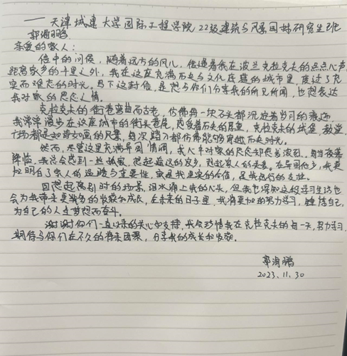 寄上我在波兰的问候。这里的学业进展顺利,生活也在慢慢适应。虽然身处异国,但我始终感受到你们的关爱和支持,这是我在远离家乡时最大的安慰。