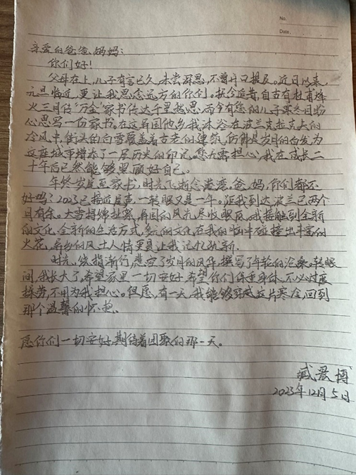 你们好!父母在上,儿子有言已久,未尝深思,不曾开口谈及。近日以来,元旦临近,更让我思念远方的你们。抚今追昔,自古有杜甫烽火三月传“万金”家书传达千里愁思,而今有您的儿子腊月寒冬目盼心思写一份家书。在这寒冷的异国他乡,我沐浴在波兰克拉科夫的冷风中,街头的白雪覆盖着古老的建筑,仿佛是岁月的白发,为这座城市增添了一层沉重的历史印记。我漫步在冰雪覆盖的街巷,每一步都似乎踏入了过去的时光。您无需担心,我在成长二十年后已然能够照顾好自己。