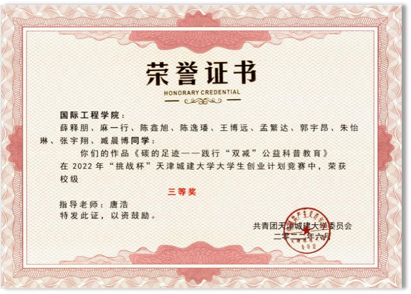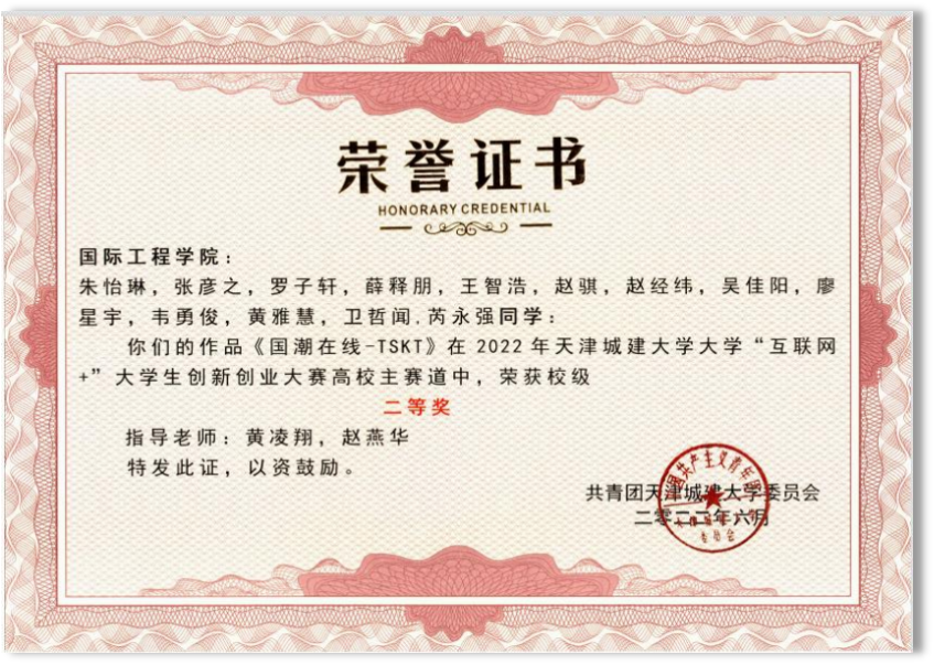 获天津市2022年“互联网+”创新创业大赛天津赛区青年红色筑梦之旅赛道获得铜奖