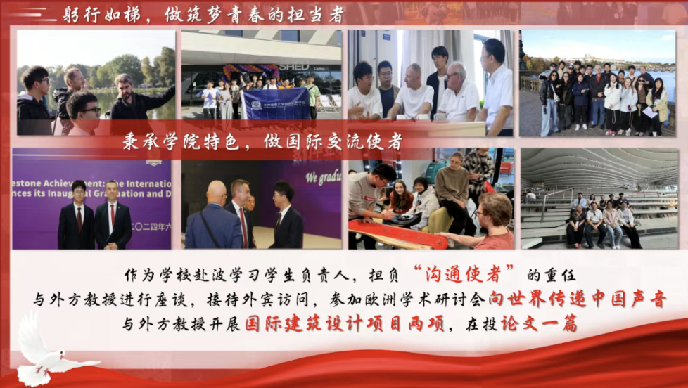 秉承公司特色,做国际交流使者,与外方教授进行座谈,接待外宾来公司访问,组织职工活动,参加欧洲学术研讨会,向世界传递中国声音,并与外方教授开展国际建筑设计项目两项,在投论文一篇。