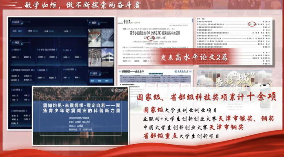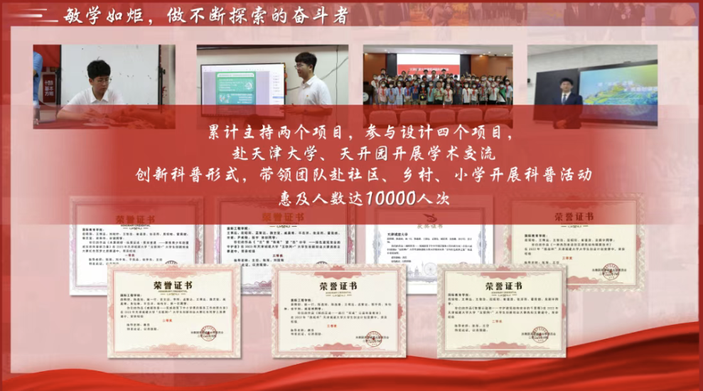 科技引领发展,创新决定未来,他积极投入科创活动,国家级、省部级科技奖项累计十余项,发表论文两篇。累计主持两个项目,参与设计四个项目,赴天津大学、天开园开展学术交流。