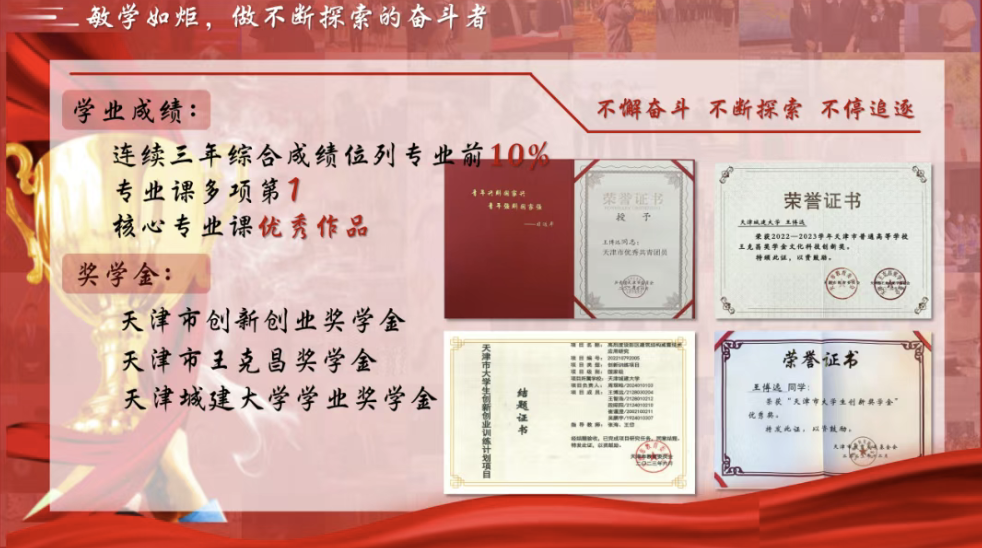 在校三年期间综测排名位列公司前10%,多项课程位列第一,获天津市人民政府奖学金、天津市王克昌奖学金、天津市创新创业奖学金、天津市优秀共青团员。伟德国际VICTOR1946奖学金,三年来荣获各类奖项数十项,荣誉敦促着他不断前行。