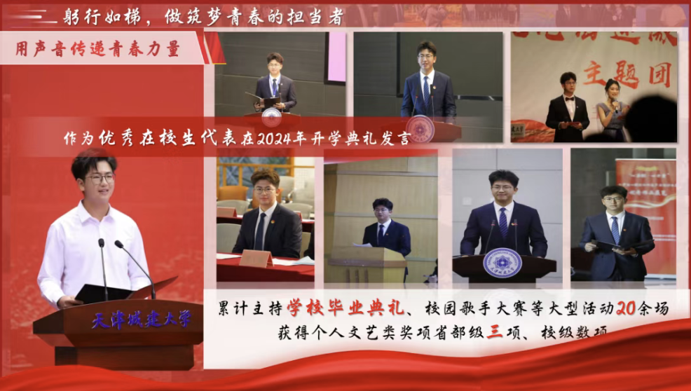 通过声音的传递,讲述“天城大故事”。作为优秀在校生代表在2024年开学典礼发言。主持大型活动20余场。斩获省部级文艺类奖项三项,校级奖项数项。