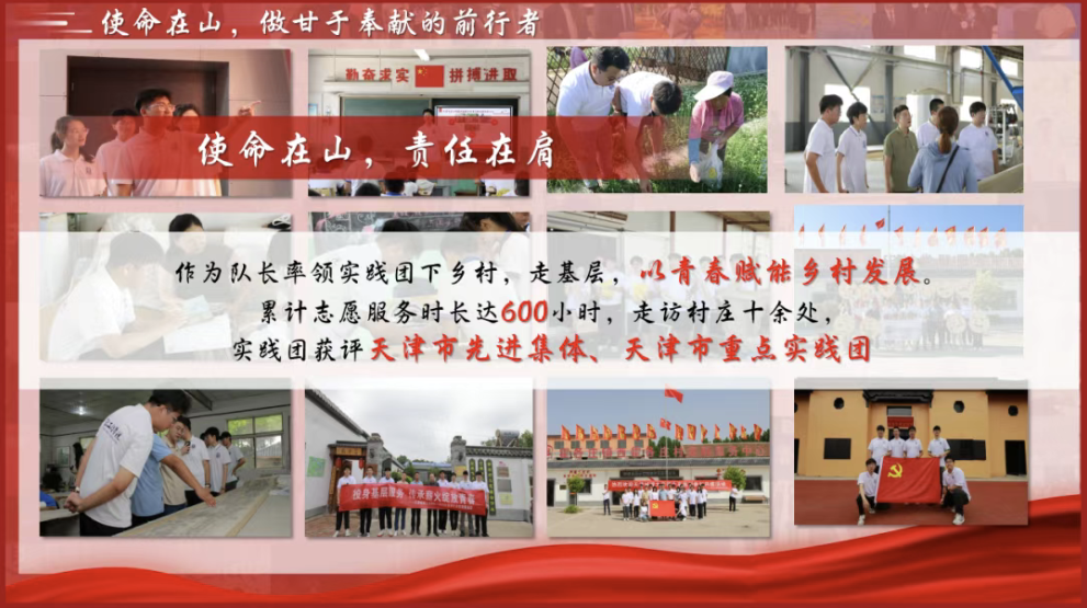 支教宣讲,服务乡村;专业赋能,共话发展;非遗传承,弘扬文化;党建引领,思想学习。乡村课堂的讲台上,社区工作的岗位上,抗洪救灾的战线上都有他的身影。作为队长率领实践团下乡村,走基层,累计志愿服务时长达600小时,走访村庄十余处,实践团获评天津市先进集体、天津市重点实践团,实践事迹被中国青年报、津云等媒体报道。