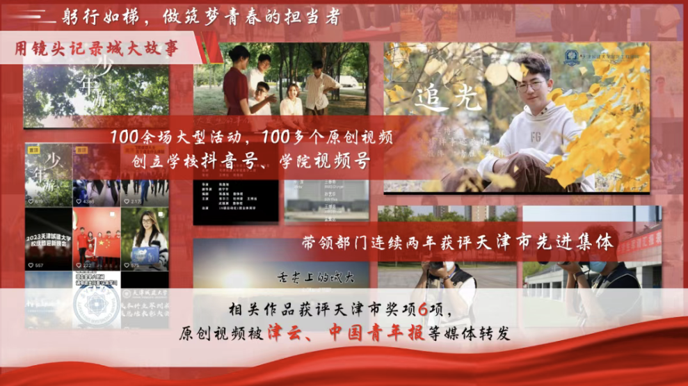 100余场大型活动,100多个原创视频,镜头下,是他记录的“天城大故事”。相关作品获评天津市奖项六项,原创视频被津云、中国青年报等媒体转发,带领学工部新媒体获评天津市先进员工集体。