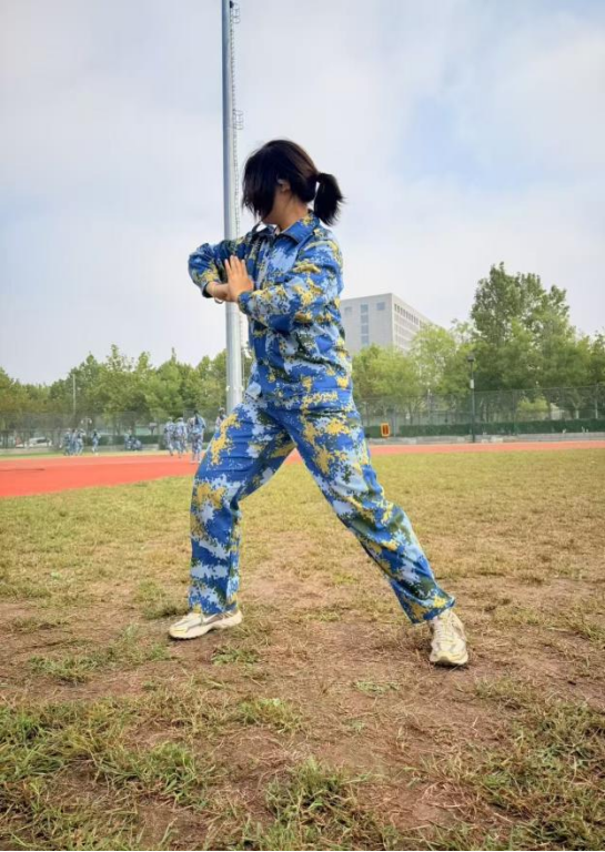 跑道上,陈馨懿专注打磨正步动作:手臂摆动的幅度、腿部抬落的高度,每一处细节都透着对 “标准” 的执着。她眉峰凝劲,眸光如炬踏正途,棱角分明的脸庞上盛满炽热的星光,将信念刻进每一次摆臂踢腿中。反复练习中,“刻苦” 是她最鲜明的标签,汗水滴落的轨迹,成了军训场最美的线条,也让她成为队列里公认的 “动作标杆”。