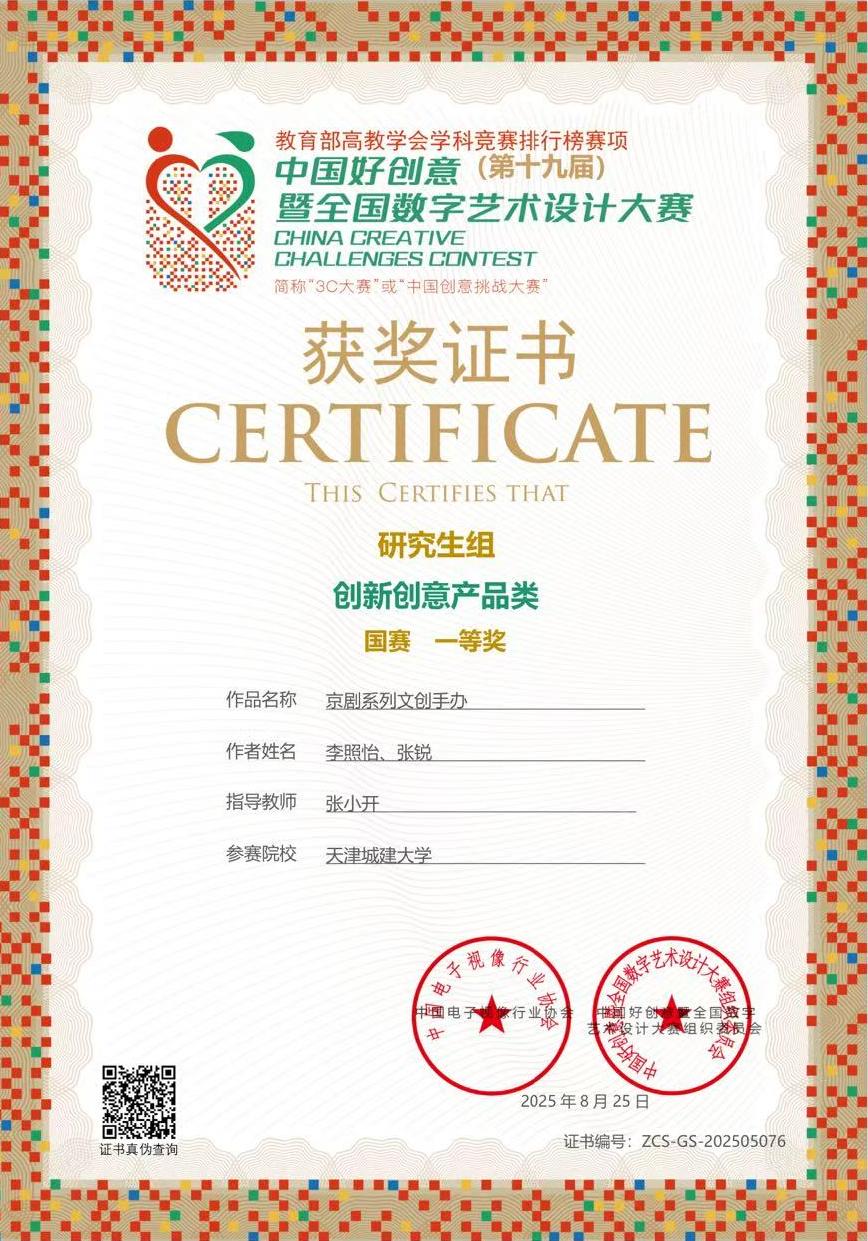 在专业竞赛中,他将理论知识与创新实践相结合。他作为核心成员完成的“京剧系列文创手办”项目,在中国好创意·第十九届全国数字艺术设计大赛中荣获国赛一等奖。此外,获2025年全国老员工数字媒体科技作品及创意竞赛省部级三等奖2项,展现了扎实的设计功底和出色的团队协作能力。