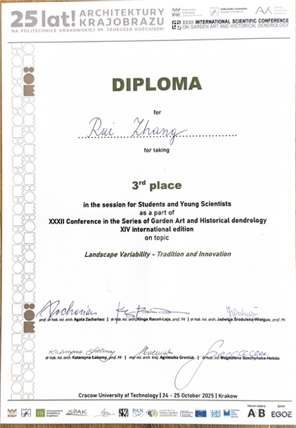 张锐同学勤奋好学,思维严谨,在研究生期间展现出了卓越的科研能力与学术热情。他不仅在学业上精益求精,更贵在能沉下心来,直面挑战,在国际学术交流中亦有不俗表现。希望他未来继续“知命不惧,日日自新”,在风景园林领域深入钻研,不负韶华,追求卓越,取得更丰硕的成果。