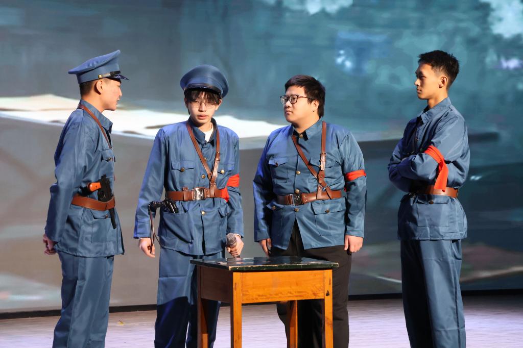 2025级建筑合一团支部的表演回溯南昌起义,将先辈浴血冲锋的峥嵘岁月搬上舞台。学子们身披戎装,俯身快速穿梭模拟战场突袭,高举红旗奋力呐喊重现冲锋时刻、紧握钢枪眼神坚毅定格战斗姿态。每一个场景、每一段演绎,都饱含着对先辈的崇敬,都在彰显红色基因的代代传承。