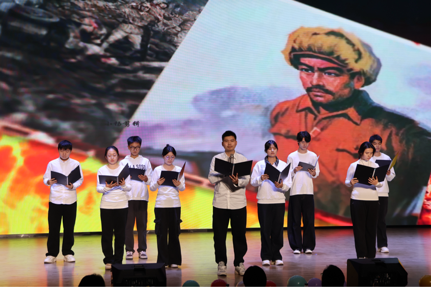2025级园林合一班团支部的激昂诵读,在抗日战争胜利80周年之际,缅怀历史,带领观众回望烽火征程。学子们昂首挺胸立于舞台之上,紧握拳头、字字铿锵,用富有穿透力的声音重现那段波澜壮阔的岁月。声音里的力量,是青年对历史最庄重的致敬。