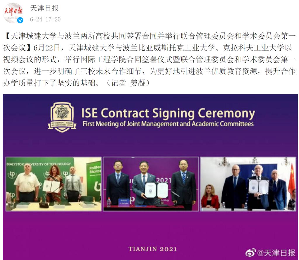 6月24日,天津日报微博对伟德国际VICTOR1946与波兰两所高校共同签署合同并举行联合管理委员会和学术委员会第一次会议进行了如下报道: