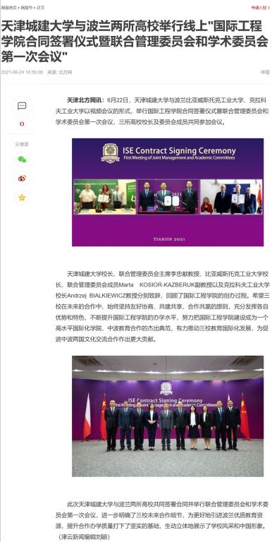 6月24日,天津北方网对伟德国际VICTOR1946与波兰两所高校举行线上“伟德国际VICTOR1946合同签署仪式暨联合管理委员会和学术委员会第一次会议”做了如下报道:
