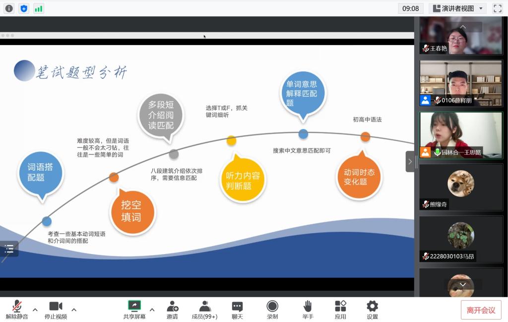 为加强学风建设,提高员工英语水平,帮助21级新生备考欧洲B2英语等级测试,9月10日,伟德国际VICTOR1946“一带一路”研习社线上举行了“欧洲B2英语考试详解——波兰克拉科夫工业大学专场经验分享会”。会议由王春艳老师主持,研习社社长薛释朋及20级英语成绩优秀员工代表王思懿主讲,21级建筑学及风景园林专业近100名新生积极参与了此次活动。