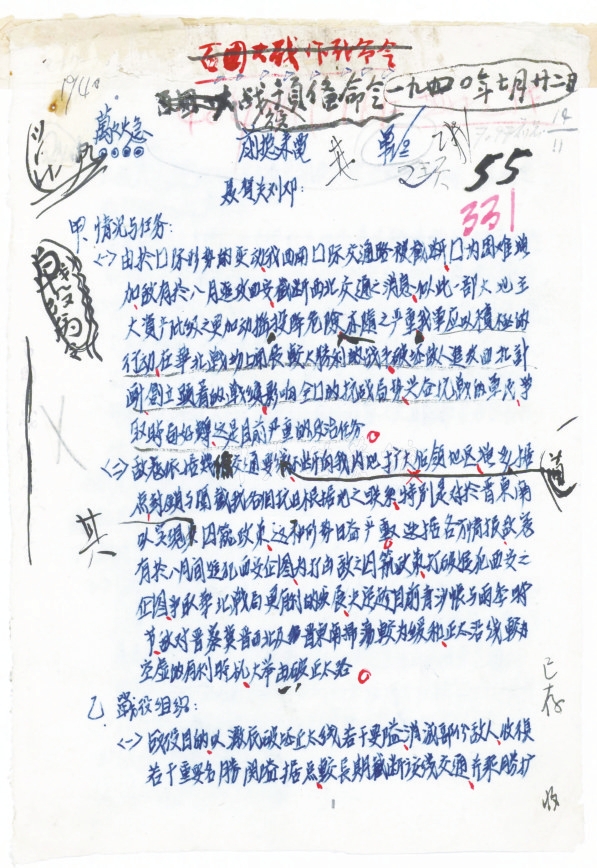 1940年7月22日,《朱德、彭德怀、左权关于破击正太路的预备命令》(中央档案馆 藏)