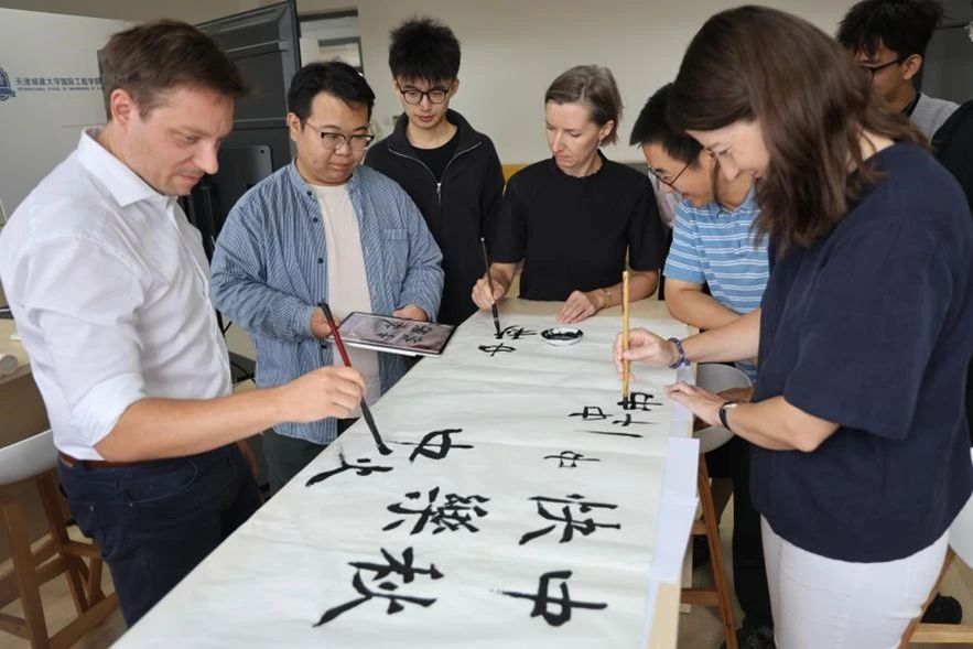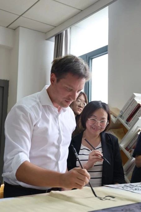 携一纸水墨回嗅记忆中的芬芳,墨香浓浓,融尽千年古韵;国工学子于中秋佳节执笔落墨,为外籍教师展示书法作品、传统国画,一横一竖含情意绵长,一笔一画留无限相思。