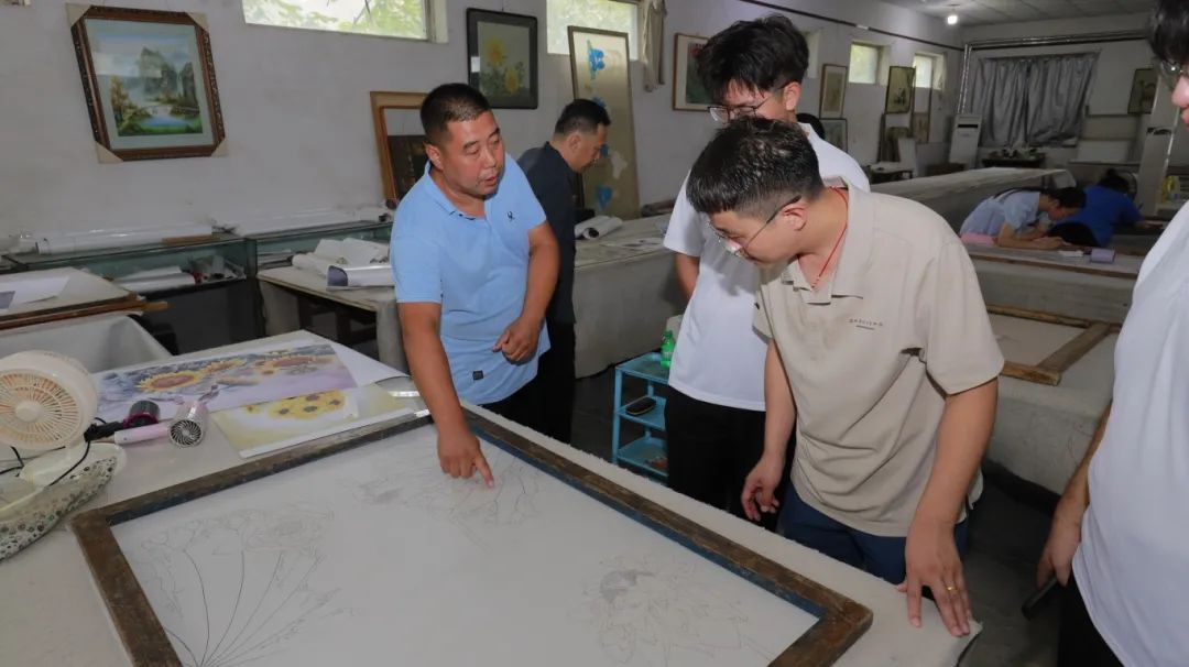 实践团成员赴河渠镇工笔画小镇,参观了艳文画院、工笔画“非遗工坊”。实践团成员与中国国画家协会理事、中国工艺美术家协会会员、县著名画家赵艳飞老师进行座谈交流,深入了解工笔画廉吏故事和宁晋历史文化。结合专业知识,同学们与工笔画画师们进行交流,为传统文化作品转化成文旅符号、文旅产品交流想法,参与工笔画创作。